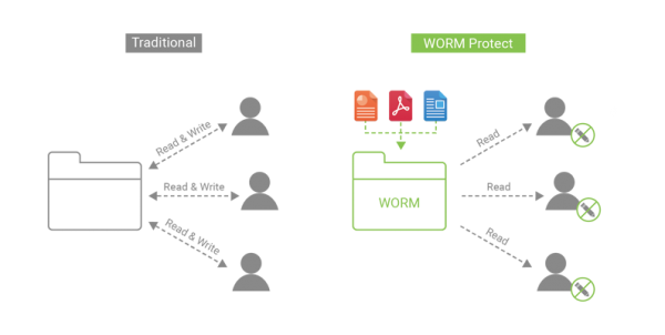WORM技术旨在防止在一定时期内对数据进行有意或无意的修改。WORM保护下的文件和文件夹只能在用户定义的时间段内读取。在期限到期之前,不能修改任何文件或文件夹。WORM可以保护您的数据免受基于加密的勒索软件的攻击。WORM将保护您的机密数据免遭未经授权的修改和威胁,确保数据的正确性和完整性。