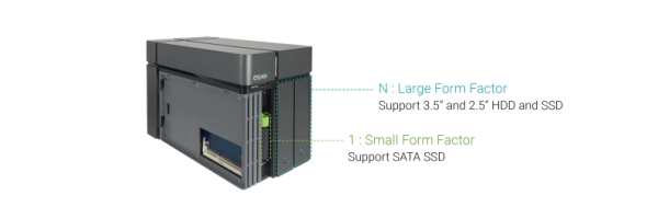 创新的机械设计使XCubeNAS成为一款多功能混合存储设备。在不影响现有大型插槽的情况下,XCubeNAS设备左侧,有原生SATA SSD小硬盘插槽位。 支持支持磁盘空间58 TB(14TB x4 + 2TB x1)。