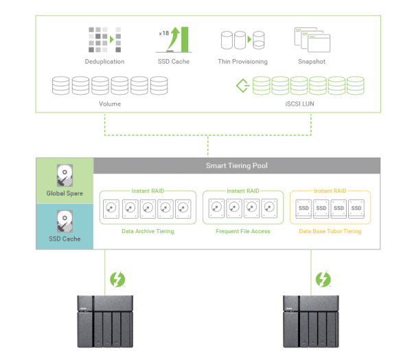 QSM 3.0 能有效解决各种应用程序对效能的需求。SSD 快取提高数据访问速度,自动分层技术针对存取频率对数据进行分类,能更加速对常用档案的读取。