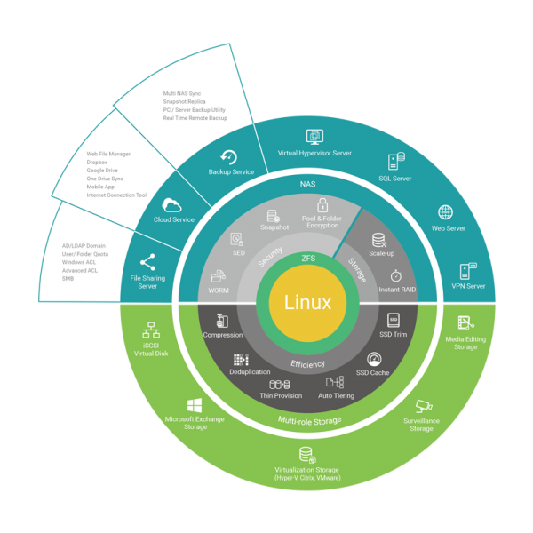 QSM 3.0 确保数据一致性及安全性。内建的校验码机制能透过档案快照自动纠正损坏的数据。多种 RAID 支持、档案及区块层级快照及多种备份方案,确保数据随时受到严密保护。支援AES-256储存池加密、一次写入多次读取(WORM)、硬盘自我加密(SED),有效防范机密数据盗取或修改。