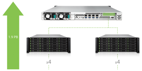 XCubeNAS机架型系列能连接QSAN产品任一扩充机柜,提供了大规模的扩充能力。它可以支援高达210个磁碟驱动器或当使用14TB磁碟时,有高达1.9PB的原始储存空间。