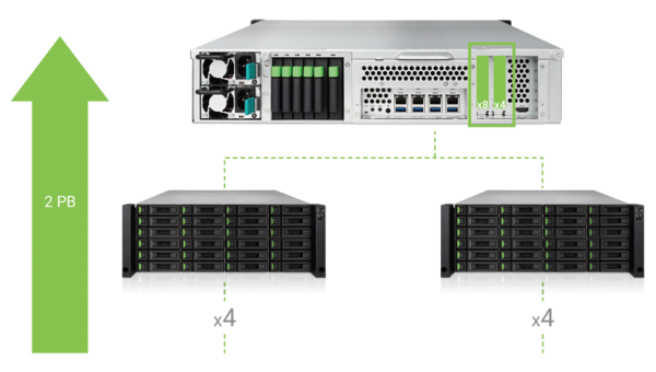 XCubeNAS机架型系列能连接QSAN产品任一扩充机柜,提供了大规模的扩充能力。它可以支援高达210个磁碟驱动器或当使用14TB磁碟时,有高达2PB的原始储存空间。