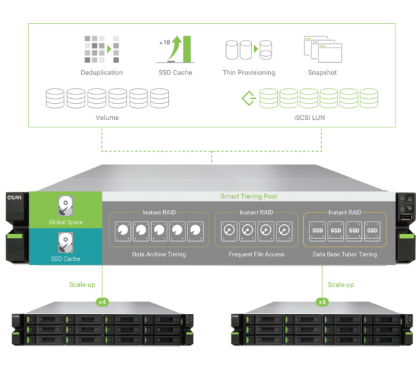 QSM 3.0 能有效解决各种应用程序对效能的需求。SSD 快取提高数据访问速度,自动分层技术针对存取频率对数据进行分类,能更加速对常用档案的读取。