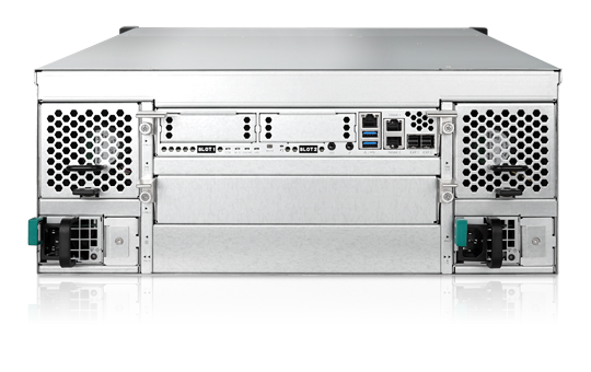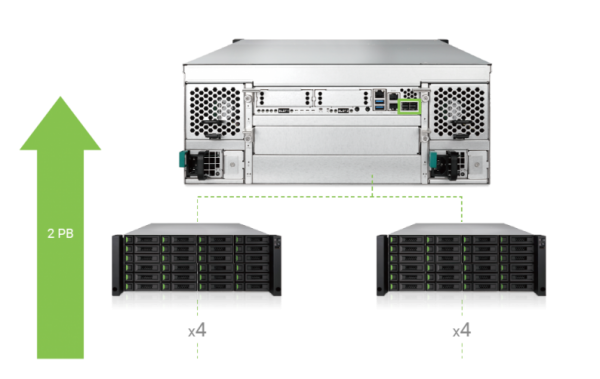 XCubeNAS机架型系列能连接QSAN产品任一扩充机柜,提供了大规模的扩充能力。当使用12TB HDD磁盘时,它支持高达232个磁碟驱动器或高达2.5PB的原始储存空间。