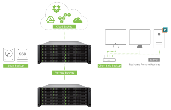 QSM 3.0 确保数据一致性及安全性。内建的校验码机制能透过档案快照自动纠正损坏的数据。多种 RAID 支持、档案及区块层级快照及多种备份方案,确保数据随时受到严密保护。支援AES-256储存池加密、一次写入多次读取(WORM)、硬盘自我加密(SED),有效防范机密数据盗取或修改。