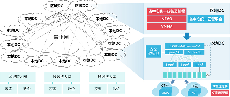 全球运营商网络转型朝着DC化方向进行,通过分级DC架构将云计算能力与网络能力融合,通过“云网融合”多维度挖掘数据属性,以数据的感知、关联、推理、发现能力来赋能通信网。通信云DC中的新型城域网基于AD-TC硬件架构和AD-TC平台架构,通信能力根据需要集中或者分散部署,运营管理集约化。