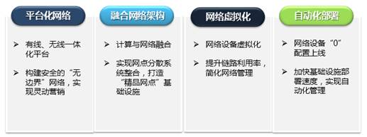 移动营销、客户WIFI服务、用户信息呈现等对无线网络建设提出了需求,网点致力于构建平台化的网络基础设施,平台化的建设思路需要解决无线网络部署、有线无线一体化运维、接入终端安全管理等一系列问题,因为WIFI建设仅仅解决了网络覆盖的延伸,但无线网络的管理无法脱离有线网络独立进行,同时网络、业务、终端和人员需要进行统一的策略制定和集中监控。