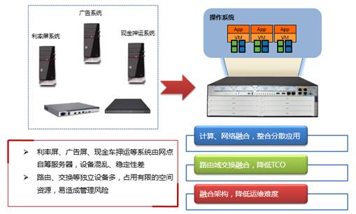 MSRG2路由器能够为用户提供网络与计算融合的基础架构,在路由交换平台的基础上,灵活的扩展计算平面,提供标准计算模块或高性能计算模块,通过H3C CAS或其他友商的计算虚拟化技术,实现网点微应用的部署。将排队系统、广告系统、利率系统、现金管理系统整合到MSRG2的网络计算融合架构中。