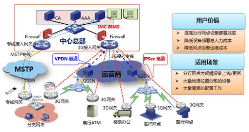 MSR路由器与IMC BIMS打造自动化网点的解决方案,能够实现大规模网点U盘或短信方式的自动初始化、批量自动配置、批量软件升级等功能需求,在设备配置管理方面可实现网点设备配置模板的管理,基于配置模板进行配置合规性检查、配置自动变更、配置自动备份、资产管理,同时可以实现对网点设备状态的实时监控和告警通告,总部管理员也可以灵活的自定义告警内容,提高网点网络的可维护性。