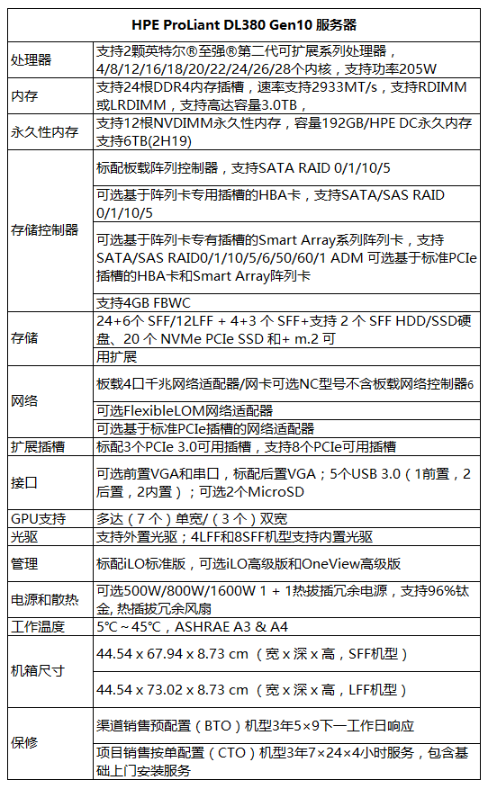 HPE ProLiant DL380Gen10服务器支持行业标准技术,英特尔至强®第二代可扩展处理器系列,提供多达28个内核,12G SAS,3.0TB HPE DDR4 2933MT/s智能内存。