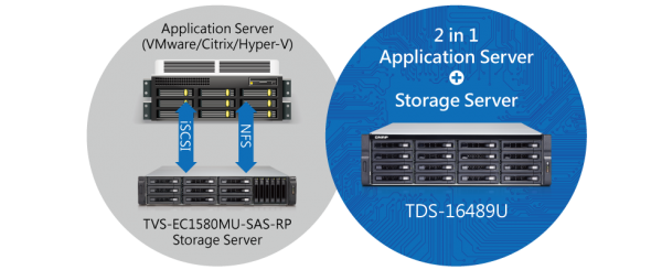 企业虚拟化应用,往往需要高效能应用运算服务器 (Application Server)、数据储存服务器 (Data Storage Server),以及 10GbE 或 40GbE 等级的高速网络,再透过 iSCSI/ NFS 将储存空间挂载至应用运算服务器来建构所需环境。现在,强大的 TDS-16489U 双服务器可一次满足所有虚拟化应用之硬件需求。透过 QNAP 自主研发的 Virtualization Station 虚拟机工作站与 Container Station 软件容器工作站,其中运行的多个服务器 Guest OS 与应用系统更可以将运算后产生的数据直接透过 SAS 12Gb/s 高速储存汇流至内部储存空间,不仅大大节省购买虚拟化软件之费用,运算、储存、虚拟三位一体,显著提升效能与降低成本。