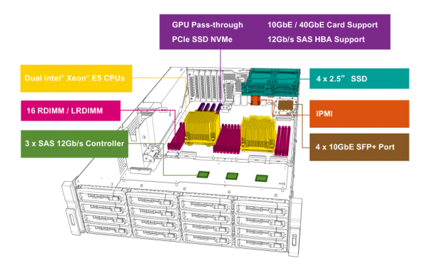 专为数据中心打造的 TDS-16489U 高规搭载两组高效能 Intel® Xeon® E5-2600 v3 处理器,提供四核、六核与八核三款选择,配有高达 1TB DDR4 2133MHz RDIMM/LRDIMM 内存 (16 DIMM),支持 12Gbps SAS 硬盘,提供优异的数据传输与运算效能。TDS-16489U 提供双运算力顺畅运作需要大量系统资源的任务及应用,可同时进行多项数据处理任务,更帮助企业组织驾驭大数据 (Big data) 巨量分析,快速掌握企业洞见、市场机会与更多商机价值。
