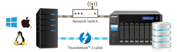 创新设计的 TVS-871T Thunderbolt™ 2 NAS 集 DAS、NAS 和 iSCSI-SAN 三种模式于一身,不仅没有传统 DAS 一次只能连结一台设备的局限,更摆脱搭建 10GbE 高速网络传输环境的成本障碍。TVS-871T Thunderbolt™ 2 NAS 重新定义私有云,赋予 DAS 与 NAS完美结合的新价值。