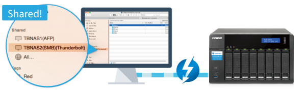 在文件式 DAS 模式下,您可以透过超高速 Thunderbolt™ 2 传输线直接连接 TVS-871T 至您的 Mac,在 Finder 中找到 TVS-871T,并直接存取 NAS 共享文件夹。即插即用,就是那么方便。