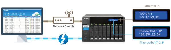 TVS-871T 支持 Thunderbolt 和 Ethernet 双网络模式,可同时分享文件至不同设备,意即透过 SMB/CIFS、NFS 和 AFP 协议分享文件至 Windows®、Mac® 和 Linux®/UNIX® 平台。使用 Qfiner 找到连接您计算机的 TVS-871T,接着便可看见 Thunderbolt IP 和 Ethernet IP,您可依需求选择不同模式进行文件分享和协同作业。