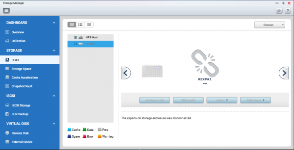 QTS 存储空间总管 简洁易懂的图像化操作接口,让您轻松管理 NAS 系统的存储空间、大幅简化 TX-500P 空间扩充设定流程、快速检视每一台 TX-500P 的系统状态及其中的硬盘健康状态。即使连接了多台TX-500P,只要利用存储空间总管的定位功能,就能轻松地辨识出 NAS 主机、RAID 存储扩充设备、硬盘及 RAID群组的位置,快速进行维护工作。