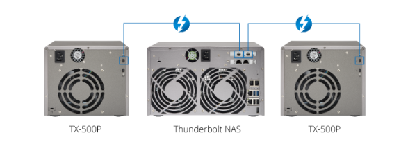 利用 Thunderbolt 2 传输线将 TX-500P 与 Thunderbolt NAS 连接后开机,系统便能自动将 TX-500P 内的硬盘判断为本机端新加入硬盘,接着透过 Thunderbolt NAS 的 QTS 存储空间总管轻松设定,即可无缝地扩充Thunderbolt NAS 存储容量。
